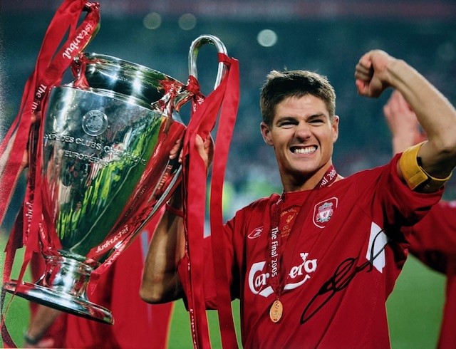 A stunning hand signed photograph of Liverpool legend Steven Gerrard celebrating after theunforgettable Champions League Final in Istanbul.